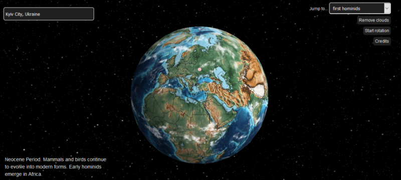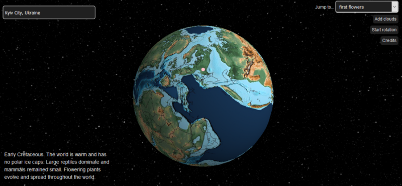 Выбрав геолокацию и установив отметку времени на интересующий вас период, например, на времена динозавров или зарождение первой молекулярной жизни, можно увидеть, как выглядела территория вашей страны или города и в какой точке земного шара она находилась в те времена. Вот так выглядел Киев во времена появления первых цветов на Земле.