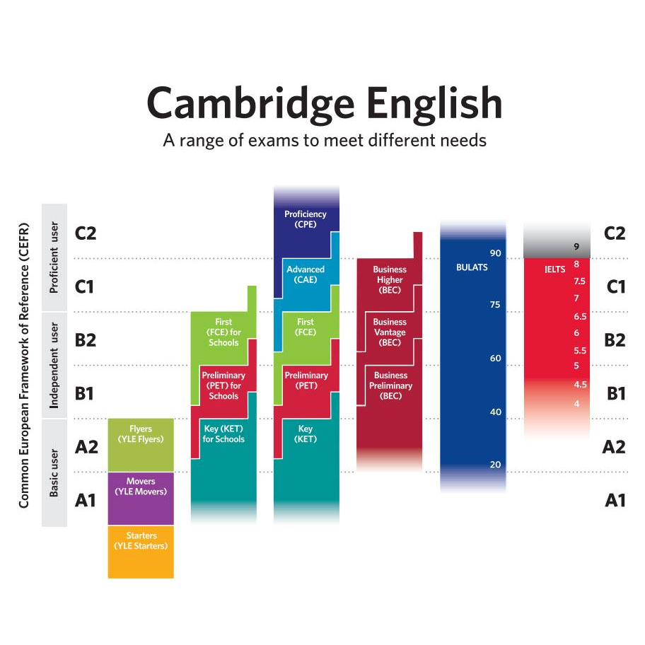 Стосовно англійської, найбільш престижними й визнаними в усьому світі є іспити Cambridge English, які також мають 6 базових рівнів, що спираються на СEFR: