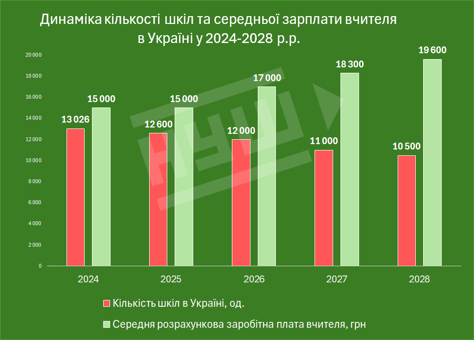 На тлі прогнозів щодо скорочення кількості шкіл уряд обіцяє підвищення заробітної плати для вчителів. Якщо нині (2024–2025) середня розрахункова зарплата вчителя без урахування ЄСВ складає 15 000 грн, то вже: